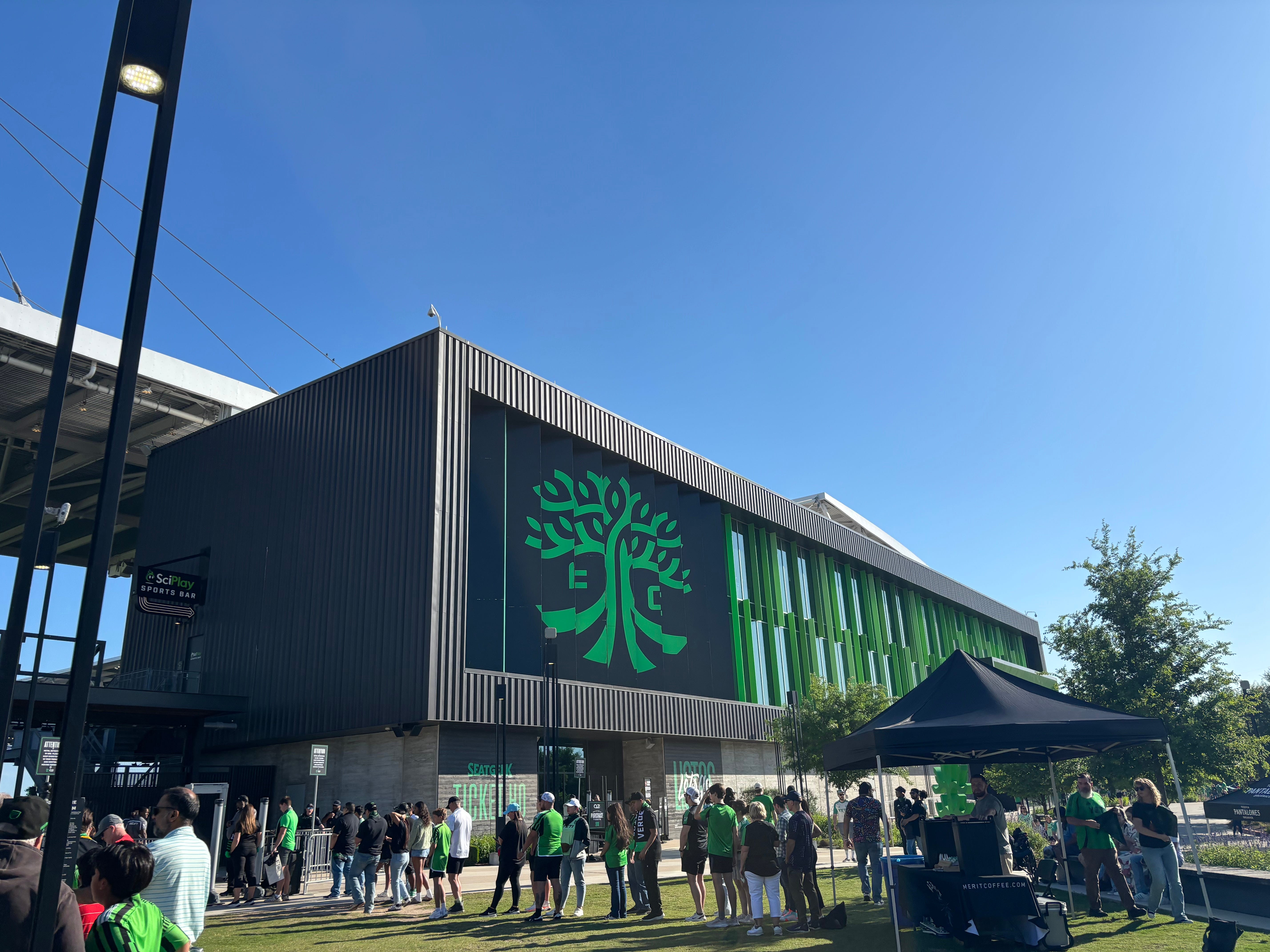 After a nice walk from the Domain Shopping Mall, we arrived at Q2 Stadium. With it being so new (opened 2021), it easily takes the cake as the coolest soccer stadium I’ve been to in person. The walkway was so open and easily to walk around, the concessions were spread out well and the team store was easy to find. However, the best part is the greenery. All the seats are green and with the stadium being partially enclosed, the pitch looks even more green, creating a jaw-dropping first scene when entering the stadium.